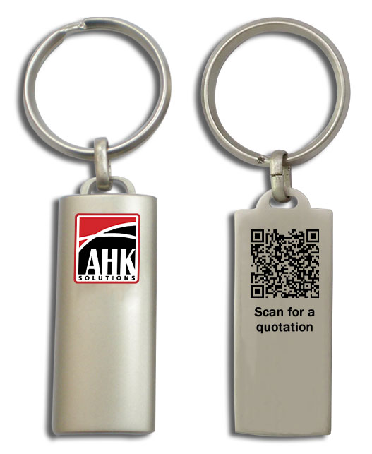 - 50 mm x 20 mm x 4 mm Injected Zamac Keyring, Cambered 3D on the front without enamel, flat on the back